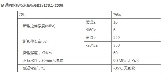 優(yōu)良的防滲性;高阻隔性;高抗穿刺性;無(wú)化學(xué)污染;耐酸堿及多種化學(xué)物質(zhì);優(yōu)良的延伸率及耐磨性;尺寸穩(wěn)定性好;粘接性好;施工方便。 隧道防水板一般分為HDPE防水板和EVA防水板,現(xiàn)在也有復(fù)合防水板。